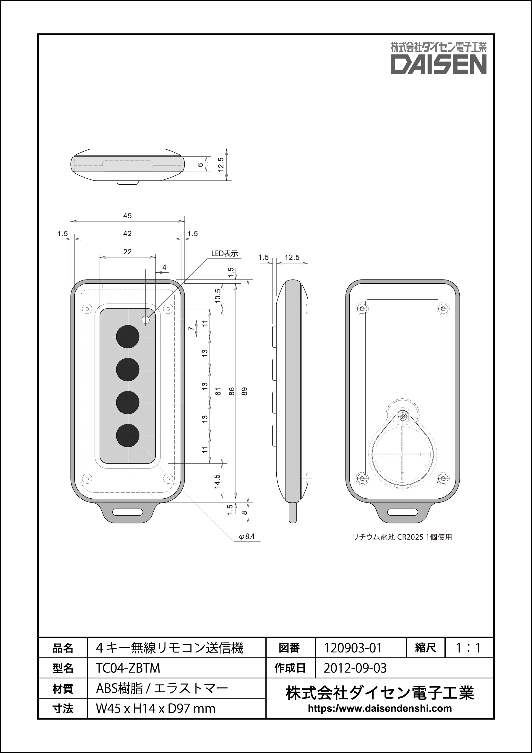 NEC製小電力無線モジュール『ZB24TM-E2036』を使用した、2.4GHz帯の無線リモコンです。(国内電波法における技術基準適合証明、並びに海外電波法[FCC・CE]認可取得済み) 屋外では様々な光源による妨害があるため赤外線による通信には適さず、無線通信が用いられることが特に多く、また赤外線とは違って指向性がないため、受信機の設置場所を問わず通信が可能です。 出荷時に送信機・受信機間でデバイスIDによるペアリングを施せるため、複数台使用の環境下においても干渉を起こさず確実な通信が可能です。送受信機間の通信は、1対1はもちろん1対NからN対Nまで様々な通信形態で使用可能です。電池の寿命はおよそ1年、通信距離は見通し約50mですが、共に使用環境によってはこの限りではありません。