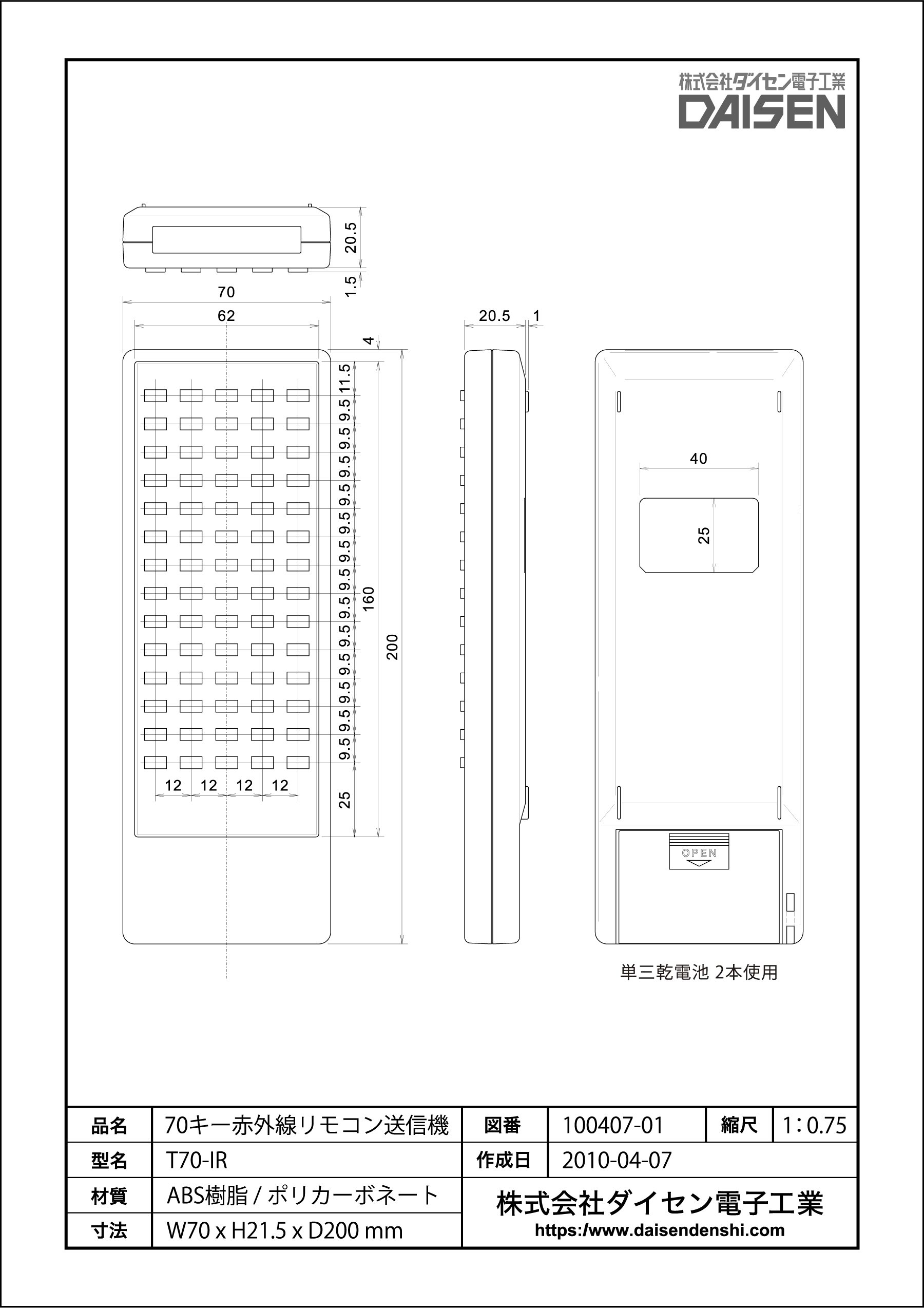 赤外線発光により通信を行う70キーリモコン送信機です。